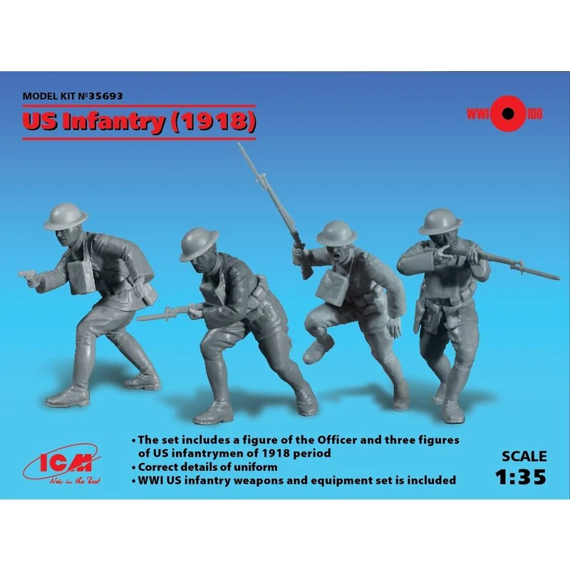Figuren Infanterie van de VS (1918) (4 cijfers) (WWI) (100% nieuwe mallen) & bullet – De set bestaat uit een figuur van de Officer en drie cijfers van de Amerikaanse infanteristen van 1918 periode & bullet – Correct details van de uniforme & bullet – WWI US infanterie wapens en uitrusting set inbegrepen