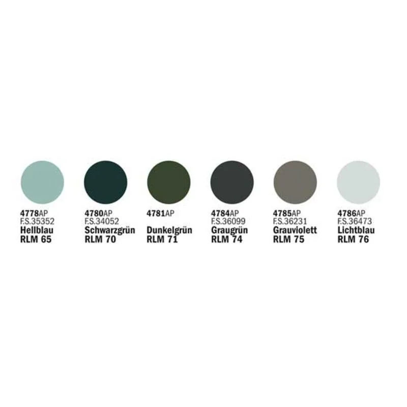 (Bf109, Fw190, Stuka, Ju88, He111…)Hellblau RLM 65Schwarzgrün RLM 70Dunkelgrün RLM 71Graugrün RLM 74GrauPurplet RLM 75Lichtblau RLM 76L’essentiel est dans la boîte and à un prix avantageux !