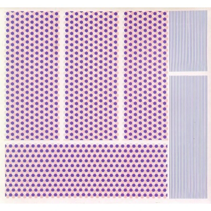 Thin Blue stripes and lozenge in pink, purple and clear to paint the third colour
